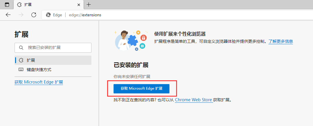 1、打开 Edge 浏览器,点击右上角【设置】,选择【扩展】,点击获取 Microsoft Edge 扩展。