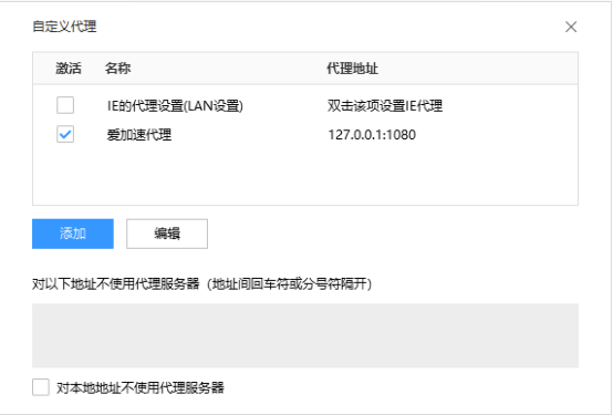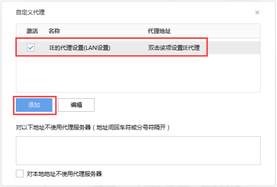 4、在自定义代理对话中,点击“添加”按钮来添加新的代理,如图所示: