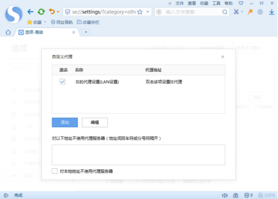 3、选择后系统会弹出一个新的选项卡页面及自定义代理的对话框,如图所示: