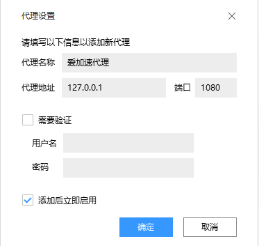 5、点击“添加”按钮后,系统弹出一个代理设置对话框,在对话中需要填写:代理名称(依据自己需求添加)、代理服务器IP地址和端口信息。打开爱加速换IP软件,选择“手动代理”协议,点击服务器连接,即可轻松获取HTTP/Socks5代理相关的IP、端口等信息。