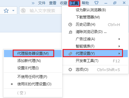 2、点击“工具”菜单,选择“代理设置(Y)”菜单项,点击“代理服务器设置(M)”,如图所示: