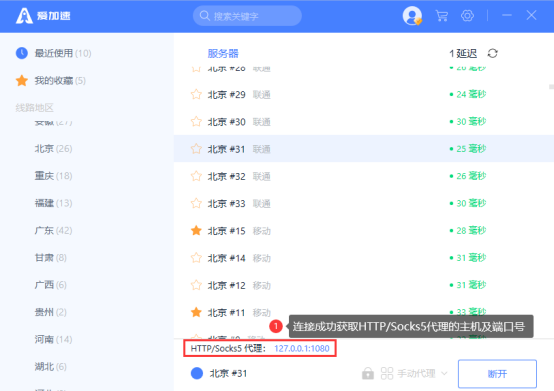 3、打开爱加速换IP软件,切换“手动代理”模式,选择服务器进行连接,获取HTTP/Socks5代理相关的主机号、端口号。