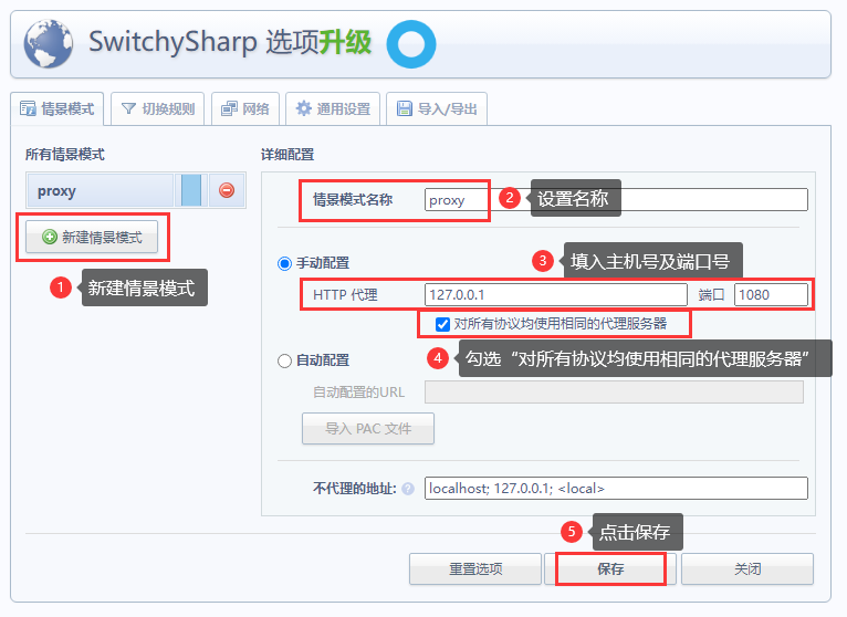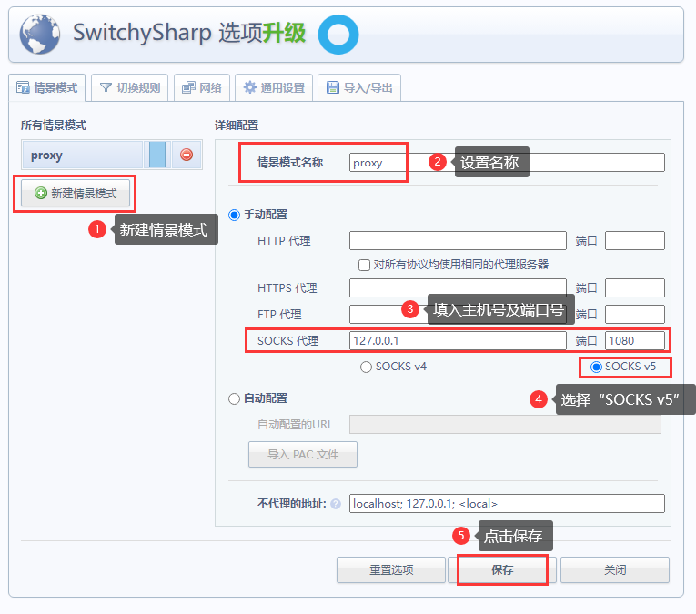 ② Socks5代理:新建情景模式,设置情景模式名称,选择“手动配置”,在“SOCKS代理”一栏中填入主机号及端口号,勾选“SOCKS v5”,保存完成设置。