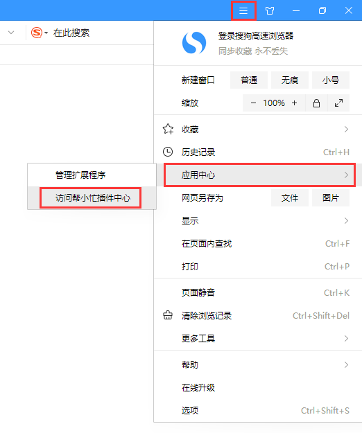 1、打开搜狗浏览器,右上角点开菜单栏,找到“应用中心”,选择“访问帮小忙插件中心”。