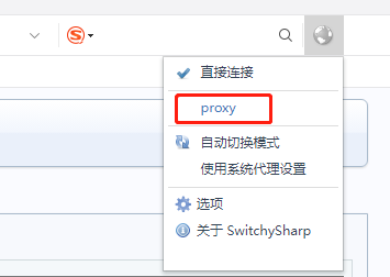 5、在插件栏点击插件“SwitchySharp”,选择设置好的情景模式“proxy”使用代理,关闭代理则选择“直接连接”。