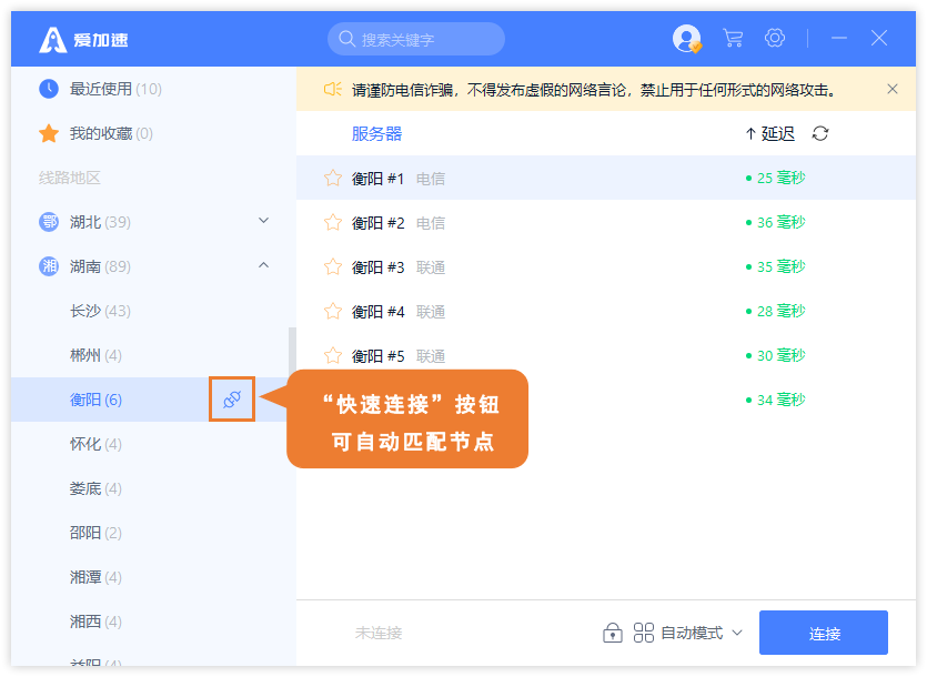 【选择多样】在衡阳地区,爱加速代理部署下了6台服务器。你将获取长期有效的衡阳静态 IP 地址,持续、稳定地获取当地网络资源。衡阳的 IP 由当地的电信、联通2家运营商提供,每台服务器后都清晰标注了其所属的运营商名称,你可以根据实际需求与习惯进行挑选。